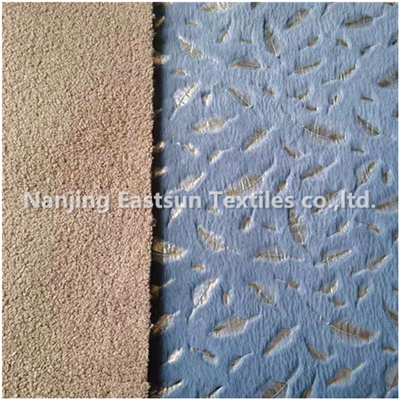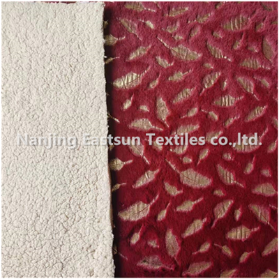 b. our tricot / warp knit rabbit fur with 350gsm, 10mm pile length , with grey/ wine/ beige col , then making golden feather design foiling on the rabbit fur .